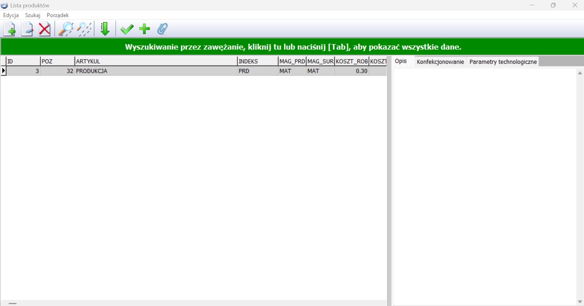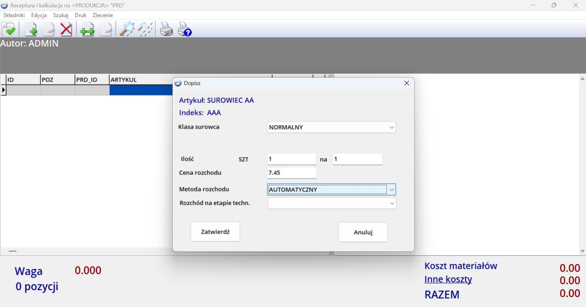 Specyfikacja materiałów do pobrania, widniejąca na dyspozycji, powstaje automatycznie w oparciu o recepturę danego produktu.