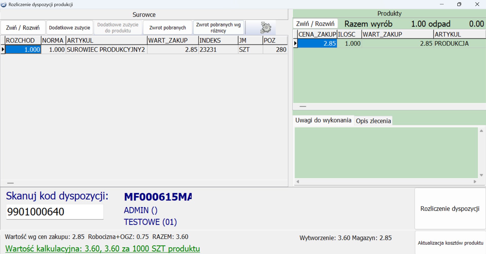 Pracownik wykonujący zadania wyspecyfikowane w dyspozycji na bieżąco rejestruje etapy swojej pracy. W tym celu skanuje kod kreskowy widniejący na dyspozycji, a następnie wpisuje ilość odkładanego po wytworzeniu produktu. Pozwala to na ścisłą kontrolę zaangażowania i efektywności w ciągi wszystkich godzin zmiany, i bieżące monitorowanie postępu pracy. Zarejestrowanie faktu wykonania puli produktów skutkuje także automatycznym rozchodem surowców oraz zwiększeniem stanu produktów gotowych. Dzięki temu dział zaopatrzenia posiada najbardziej aktualne informacje o stanie surowców. Z kolei nowo wytworzone produkty mogą trafić do obrotu nawet przed ostatecznym rozliczeniem dyspozycji.